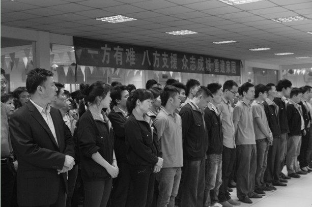 早上7:45分,募捐活動尚未開始,但捐款箱前已經(jīng)早早的排起了長龍,各部門整齊列隊。活動開始,首先公司卓勁松總經(jīng)理帶領全體員工向在雅安地震中遇難的同胞默哀。