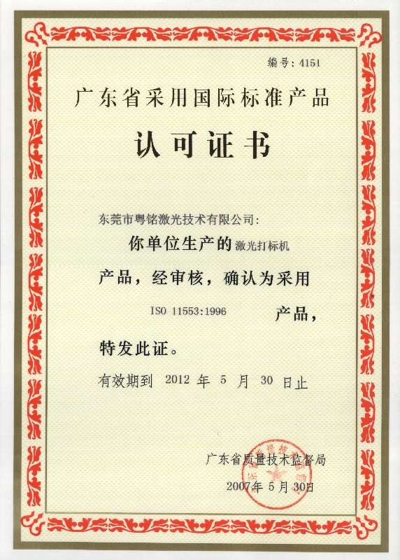 粵銘激光從技術專利化、專利到標準,不僅是在管理上升級,而且,也是企業在市場上競爭制勝的法寶。技術專利化,專利標準化,標準國際化是粵銘激光采標的真正意義。根據廣東省技術監督局批準,粵銘激光自六月四日起產品全部實施采標,所有產品標準將自動升級,這樣更加有利于企業產品參與國際市場競爭。