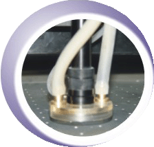 采用上下分離的吸風裝置,下吸風裝置位于平臺工作板下,并使平臺工作板形成負壓,使加工材料能穩定的固定在平臺工作板上;上吸風裝置與切割頭同時運動,以保證切割時產生的煙霧及粉塵被吸走。最終確保加工材料的精度及表面清潔度。精確的顯微攝像定位系統,能非常準確地定位被切割的LCD屏,保證切割精度。