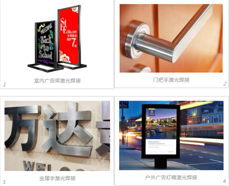 在廣告行業(yè),手持式激光焊接機可用于金屬字、廣告牌、標(biāo)識牌金屬板、廣告燈箱金屬板、廣告金屬展示架等產(chǎn)品在內(nèi)的金屬材料焊接,手持式激光焊接機采用非接觸式焊接工藝,焊接高效高速,焊縫平滑漂亮,可加工范圍廣,操作簡單,上手即可焊接,無需花費高額的培訓(xùn)成本。