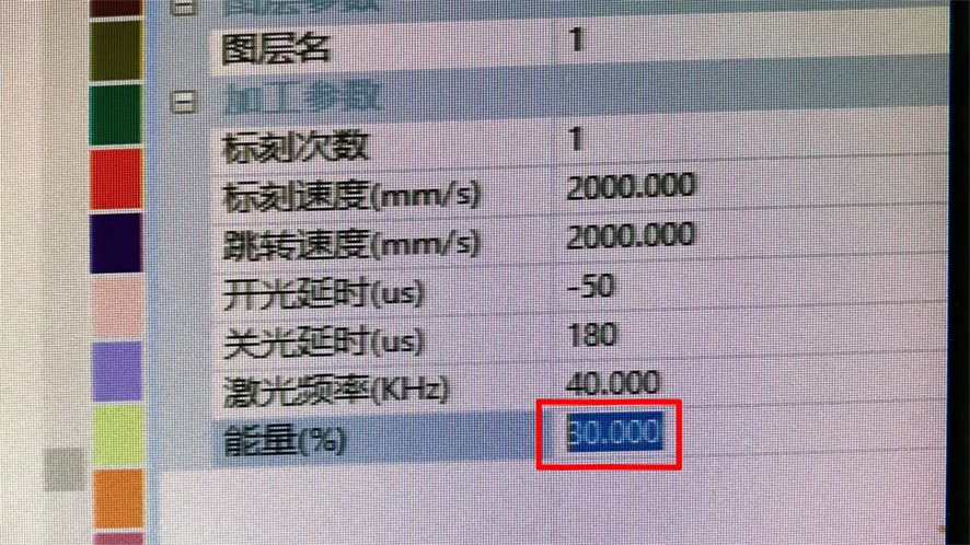 6、正常開機后,能量調至30%以下,空打出光預熱約10分鐘,再進行生產加工。
