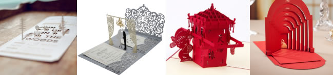婚禮請(qǐng)柬完全可以摒棄正正方方的外觀,在電腦上制圖后,婚禮請(qǐng)柬激光鏤空機(jī)就能不受限制地依據(jù)圖紙上的內(nèi)容制作出所需要的圖案或文字內(nèi)容,打開(kāi)請(qǐng)柬后便能出現(xiàn)立體的圖形。