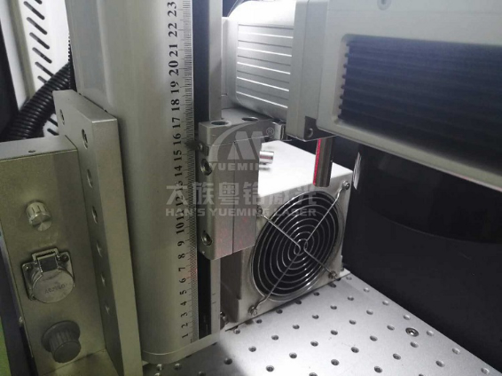 首先,我們需要先調(diào)的是焦距。我用的是大族粵銘激光最新的一款桌面式的光纖激光打標(biāo)機(jī),型號(hào)是MF-P-C,功率20W。因?yàn)椴讳P鋼打黑是需要離焦的,因此我們需要把焦距降到比正常值低1-2mm左右。