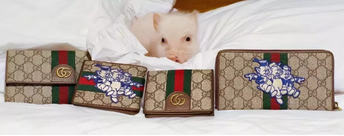 本次GUCCI豬年系列除了經典的雙環LOGO,最引人注目的便是“三只小豬” 激光切割貼布繡圖案了。可愛的豬豬貼布繡正是來自于迪士尼的經典動畫形象——《三只小豬》